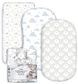 100% Organic Cotton Jersey Fitted Bassinet Sheets - Neutral Colored Elephants, Clouds and Bubbles Patterns